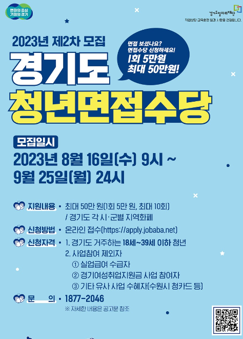 경기도 청년의 적극적 구직활동을 지원하고자 '경기도 청년 면접수당' 1회당 5만 원씩 최대 50만 원을 지역화폐로 지급하는 사업입니다. 기간 내 신청하셔야 받을 수 있으니 서두르세요.