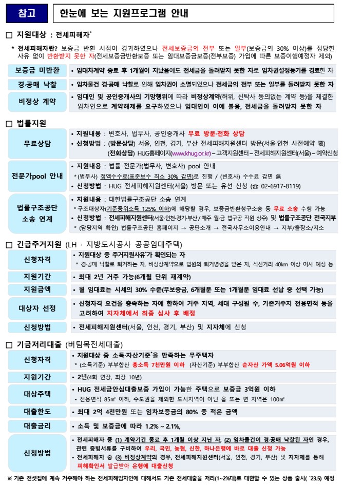 5) 경기도, 부산시는 국토부, 경기주택도시공사, 부산도시공사, 주택도시보증공사(HUG), 한국토지주택공사(LH), 대한법률구조공단 등과 협력하여 지역 전세피해지원센터를 구축하고 경기도는 3월 31일, 부산시는 4월 3일 상담을 개시하며, 경기, 부산지역 전세피해지원센터에서는 긴급주거지원 신청, 저리대출을 위한 전세피해확인 신청과 함께 변호사, 법무사 등 전무가 법률상담, 법률구조공단 소송 연계등을 지원받을 수 있습니다.