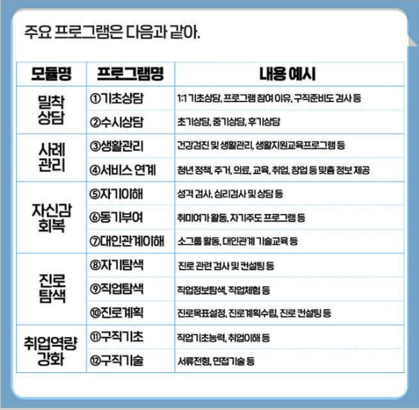 - 지원금 말고도 다양한 혜택이 있습니다. 밀착상담, 사례관리, 자신감 회복, 진로 탐색, 취업역량 강화 등 여러 프로그램을 통해서 취업에 대한 자신감과 능력을 향상할 수 있고 아래 표를 참고해 주세요.