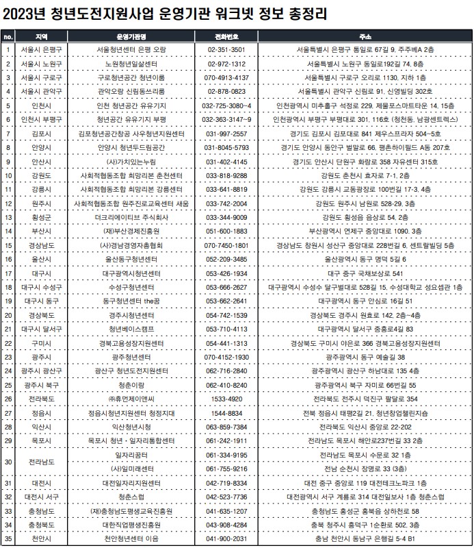 청년도전 지원사업은 지역에 따라 신청기간이 다릅니다. 대부분 분기별로 운영하기 때문에 이번에 놓쳤다면 다음에 신청가능 합니다. 운영 기관 홈페이지나 전화를 통해 확인하면 정확한 안내를 받을 수 있습니다. 2023년 청년도전지원사업 운영기관을 아래에서 확인 후 거주지가 아니어도 신청가능하니 참고하세요.
