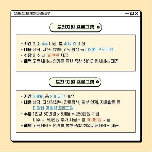 청년도전지원사업은 계속되는 취업실패로 인해 불안한 청년, 적성과 흥미 파악이 어려운 청년, 경험과 경력이 부족한 청년에게 자신감을 회복하고 취업 의지를 높이도록 다양한 맞춤형 프로그램을 제공하며 미취업 청년들에게 최대 "300만 원을 지원"하는 맞춤형 청년정책사업으로 지원대상, 지원내용, 신청기간, 신청방법을 총정리했습니다.