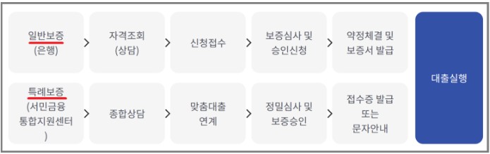 신청방법은 보증의 형태에 따라 다르지만, 일반보증의 경우에는 은행을 방문하여 상담 후 진행 여부가 결정되며, 반면 특례보증의 경우 서민금융통합지원센터를 방문하여 상담 후, 보증 승인 허가가 났을 경우, 은행을 방문하여 대출을 진행하면 됩니다.