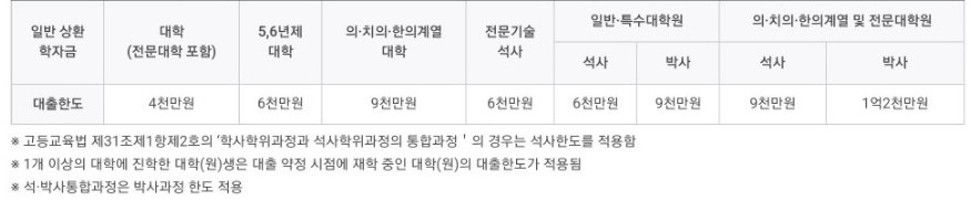 학부생의 경우 4천만 원 한도, 의치대 한의대는 9천만 원, 일반 및 특수 대학원의 경우에는 석사 6천만 원과 박사 9천만 원의 한도 내에서 일반 상환 학자금 신청이 가능합니다.